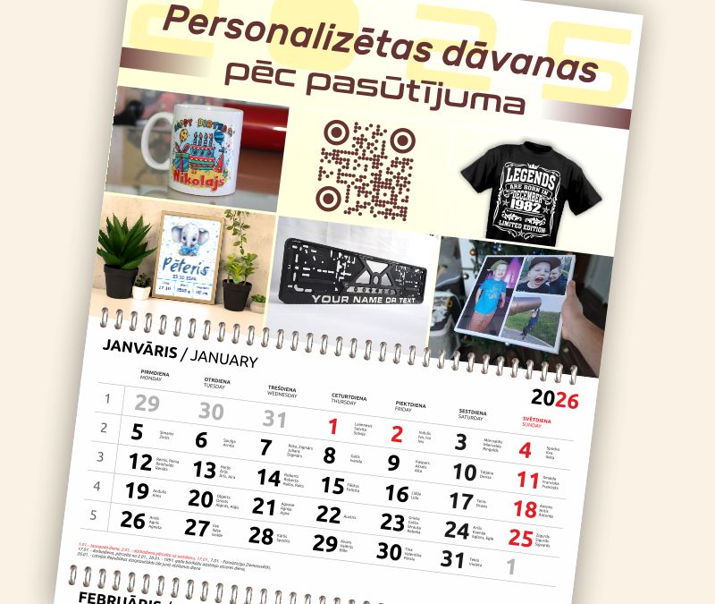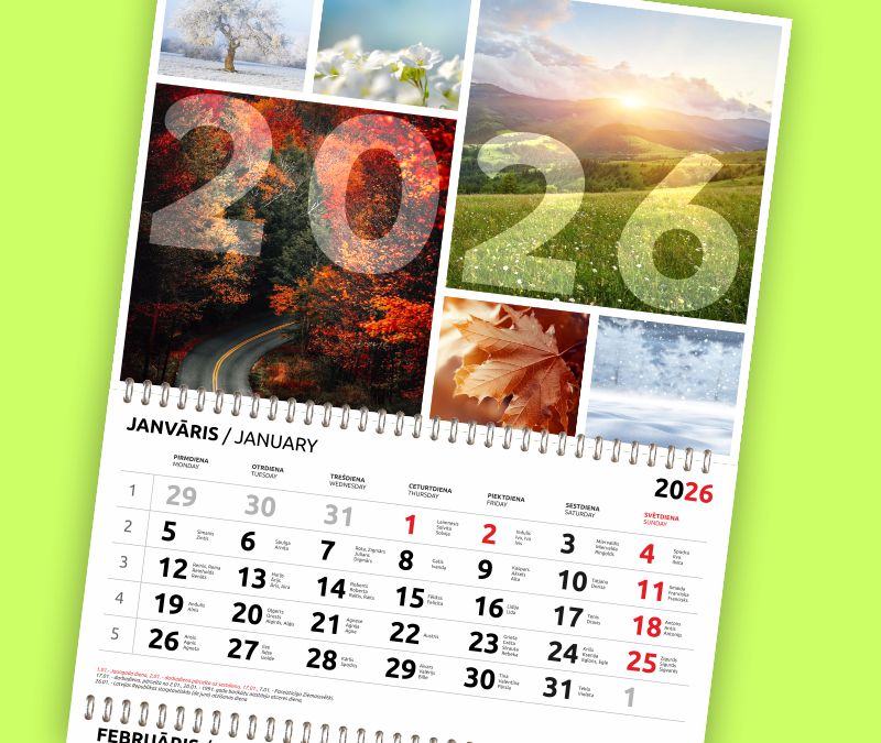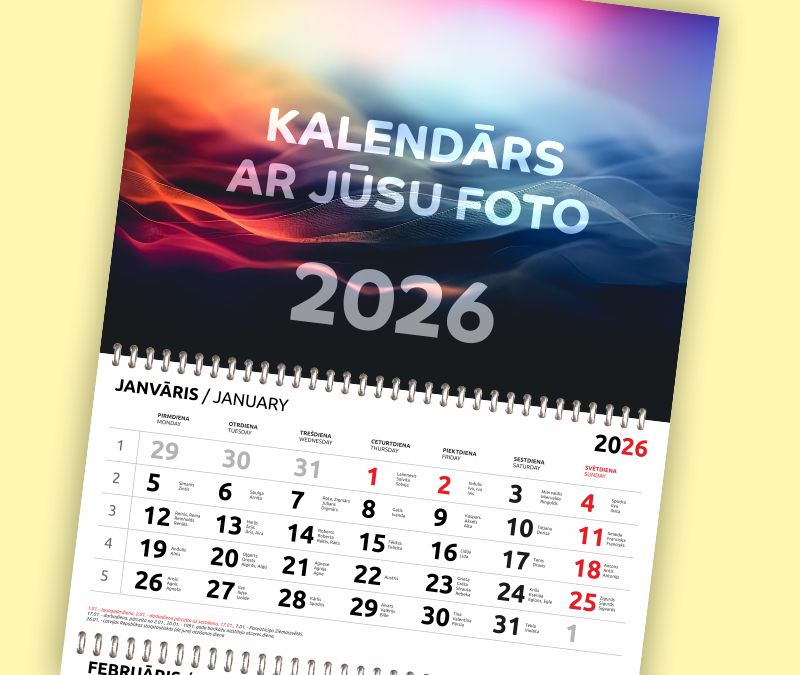 Предлагаем календари 2026 с быстрым изготовлением: настенные, настольные, карманные и календари-плакаты. Работаем по вашим фото, обрабатывая их исходя из ваших пожеланий или создаем макеты с необходимыми изображениями и текстом. Доставка: Рига, Даугавпилс, Латвия, ЕС.