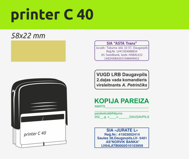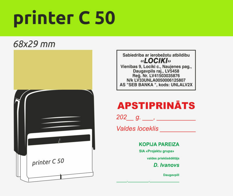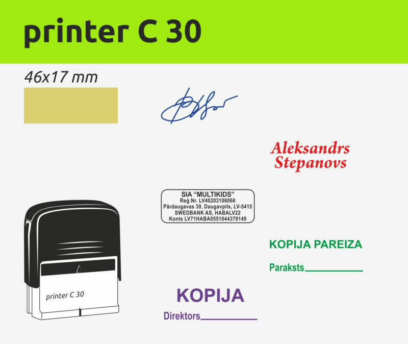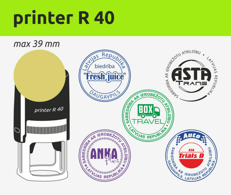Zīmoga turētājam izmantojam firmu COLOP un Shiny plastmasa automātus. Šo zīmolu automātiskie zīmogi izceļas ar korpusa izturību un uzticamību. Ir tintes krāsu izvēle. .