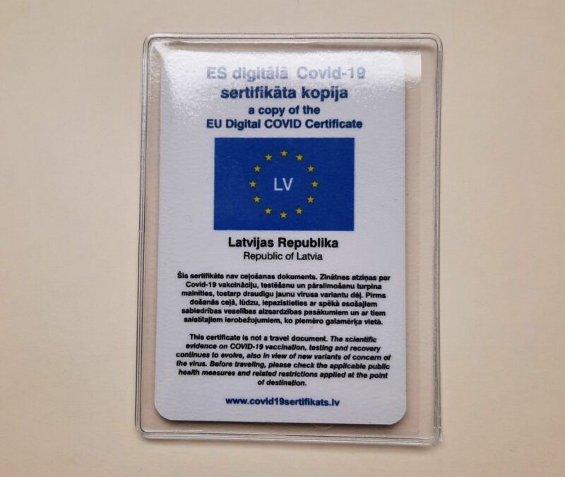 Чтобы ваши бумажные сертификаты не мялись и не терялись, распечатка сертификата Covid-19 на пластиковой основе – лучшее решение. Удобно помещается в кошельке. Размер — 6х9 см. Вышлем через почтовый автомат. Цена – 5€ + доставка