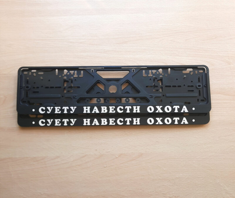 Перед выполнием нанесения на рамку для номера (держатель номерного знака) мы утверждаем макет. И после подтверждения заказа и оплаты запускаем в работу. Гарантированный максимальный срок выполнения заказа – 3 рабочих дня. Но обычно это происходит быстрее. Заказ готов уже на следующий или второй рабочий день после оплаты.